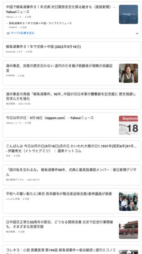 9月22日朝の時点において、Google ニュースで「柳条湖事件」を検索した結果の上位はこんな具合でした。 「柳条湖事件」検索結果 例によって中国での記念行事を伝える記事がならんでいます。今年は共同通信が配信した「満州事変、加害の歴史忘れない」という…